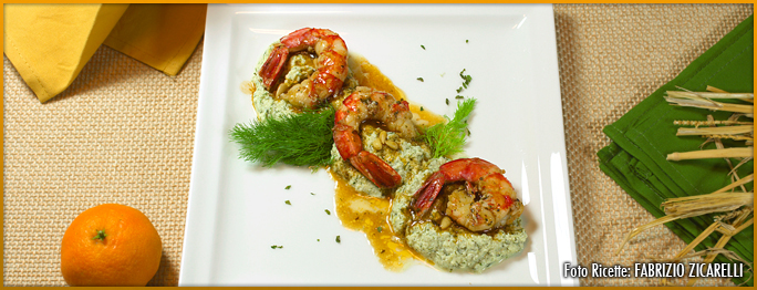 Preparate i piatti mettendo al centro il pesto di finocchi, sistemate sopra 3 gamberi a piatto con un po’ del loro sughetto e decorate con la polvere di liquirizia e un filo di miele.