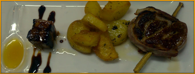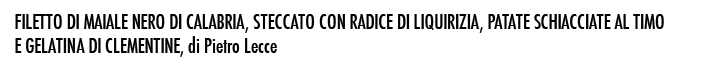 Scegliete il cuore di un filetto di suino nero di Calabria, tagliatelo in 8 fette da 100 grammi ciascuna. Bardate ognuna di esse con la pancetta tesa e steccatele con la radice di liquirizia.