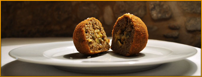 Una volta raffreddato il riso, mettetene nel palmo della mano una quantità sufficiente a formare uno strato sottile. Tenendo la mano raccolta, formate un incavo al centro e poneteci un cucchiaio di dadini di carciofo e caciocavallo, chiudetelo con altro riso e modellate l’arancino. Proseguite così fino all’esaurimento degli ingredienti. Passate tutti gli arancini così ottenuti in una pastella di farina 00 e successivamente nel pangrattato. Friggeteli, infine, in abbondante olio bollente (a 180 °C). Quando sono ben dorati, metteteli su un foglio di carta assorbente e lasciateli asciugare. Potete servirli caldi o, se preferite, anche a temperatura ambiente. |