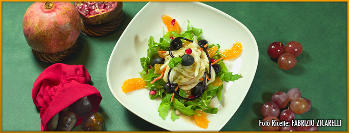 Preparate un’insalatina con le fettine di finocchio, le arance, i chicchi di melograno e le olive.